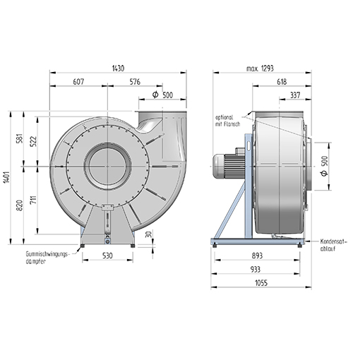 Korrosionsbeständiger Kunststoff-Radialventilator mit Gehäuse aus PE-el, elektrisch ableitfähig, in gesinterter Ausführung, einseitig saugend, Einlaufdüse mit Dichtung als Inspektionsöffnung, leicht demontierbar, Kondensatstutzen an tiefster Stelle des Gehäuses, Splitterschutz gemäß UVV als kunststoffbeschichtetes Drahtgeflecht. Laufrad GfK-el mit rückwärts gekrümmten Schaufeln, elektrisch ableitfähig, statisch und dynamisch ausgewuchtet, Auswuchtgüte mindestens G 6.3 (DIN ISO 21940-11), mit Taperlock- Buchse auf der Motorwelle befestigt. Ventilatorgestell in kräftiger Stahlschweißkonstruktion in verzinkter Ausführung, mit Motortragplatte. Ventilatorgestell geeignet zur Aufnahme des Ventilatorgehäuses mit Laufrad sowie des Motors. Minimalspaltdichtung am Wellendurchgang.Gummischwingungsdämpfer und elastische Manschetten mit VA-Spannbändern für Saug- und Druckseite sind im Lieferumfang enthalten.