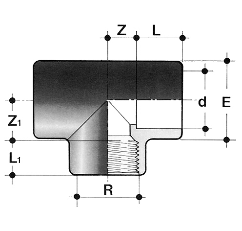 | - Durchgangsrichtung mit Klebemuffen - Abgang mit Gewindeanschluß nur für Kunststoffgewinde |